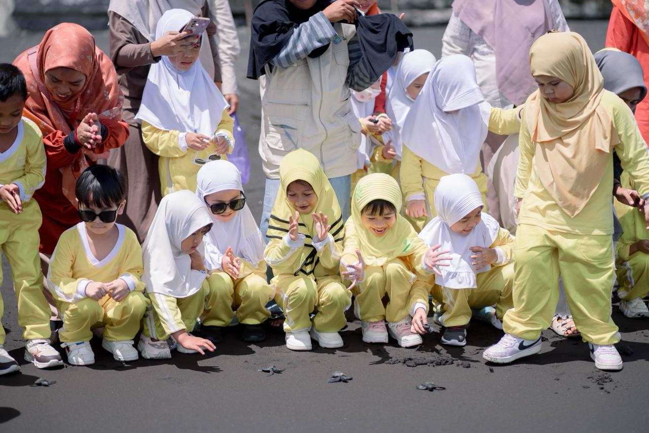 “Berhasilnya program ini bukan peran satu pihak, tapi kami semua disini mendampingi anak-anak, menjelaskan dan memberi pengertian tentang kelestarian dan konservasi penyu dengan cara menarik, serta memfasilitasi berbagai permainan agar anak-anak juga senang dan semangat,” lanjut Sumiyati.